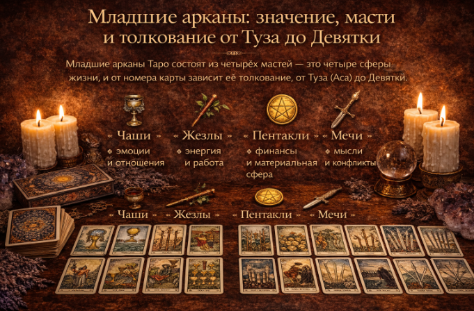 Привет! Младшие Арканы действительно часто вызывают больше вопросов у новичков, хотя они не менее важны, чем Старшие. Разница в том, что Старшие показывают глобальные темы и уроки, а Младшие -- повседневные ситуации и детали. Есть отличная статья про младшие арканы Таро, где разбираются значения мастей и толкование от Туза до Девятки. Каждая масть имеет свою тематику: Жезлы -- про действия и энергию, Кубки -- про эмоции и отношения, Мечи -- про мысли и решения, Пентакли -- про финансы и материальное. А номер карты показывает стадию развития ситуации -- от начала (Туз) до завершения (Десятка). Например, Тройка Кубков -- это радость в отношениях, веселье с друзьями, а Пятерка Мечей -- конфликт, поражение. Придворные карты могут означать как реальных людей, так и качества характера или роли, которые мы играем. С практикой всё становится понятнее!